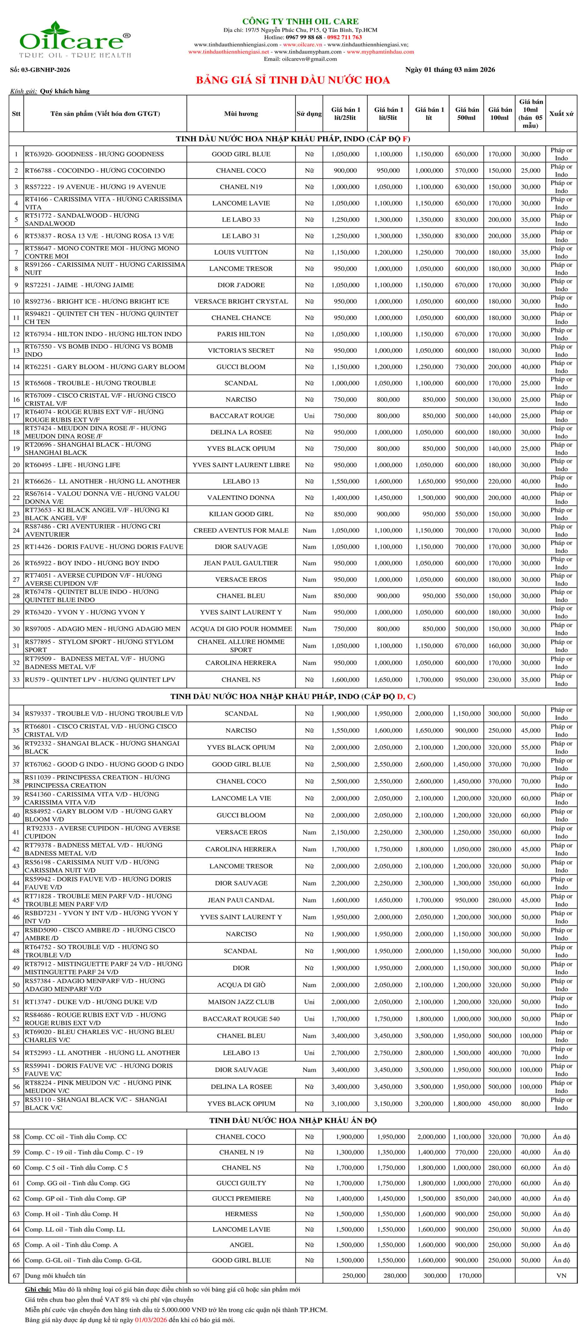 Xem giá bán sỉ lít kg buôn rẻ hơn 60 loại tinh dầu nước hoa tại đây